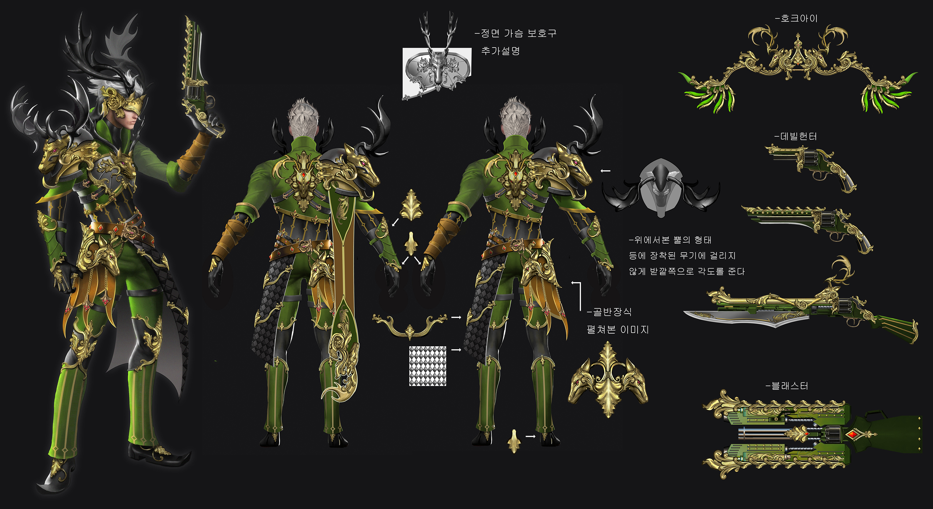 헌터의 직업군에 맞게 숲속의 고대 신성한 종족의 백발백중의 사격술과 강력한 자연과 힘의 상징인 사슴의 뿔이