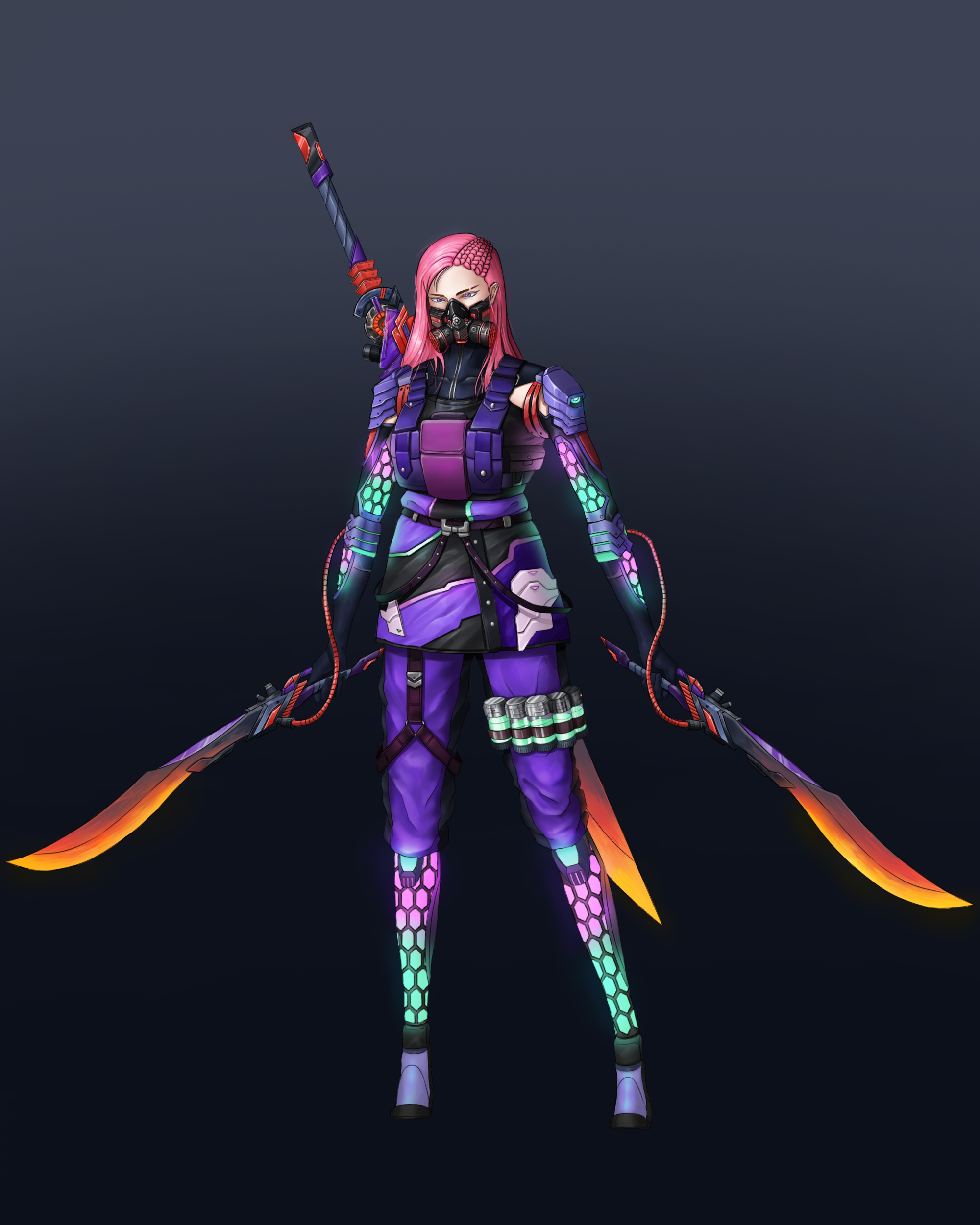 사이버펑키한 느낌을 주기 위해 의상 스타일 또한 테크웨어 룩을 참고하여 제작해 보았습니다.
