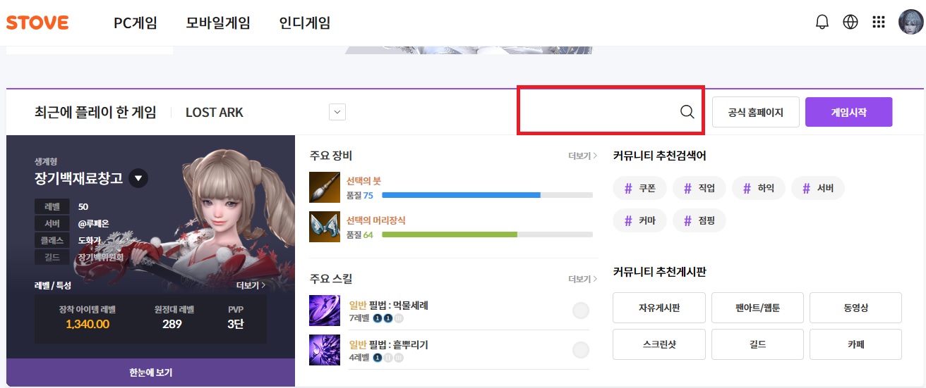 로아 공홈 왼쪽 구석 모서리 부분에 STOVE 클릭하시면 나오는 해당 페이지에서 돋보기 모양 누르시고 검색하시면 되요..