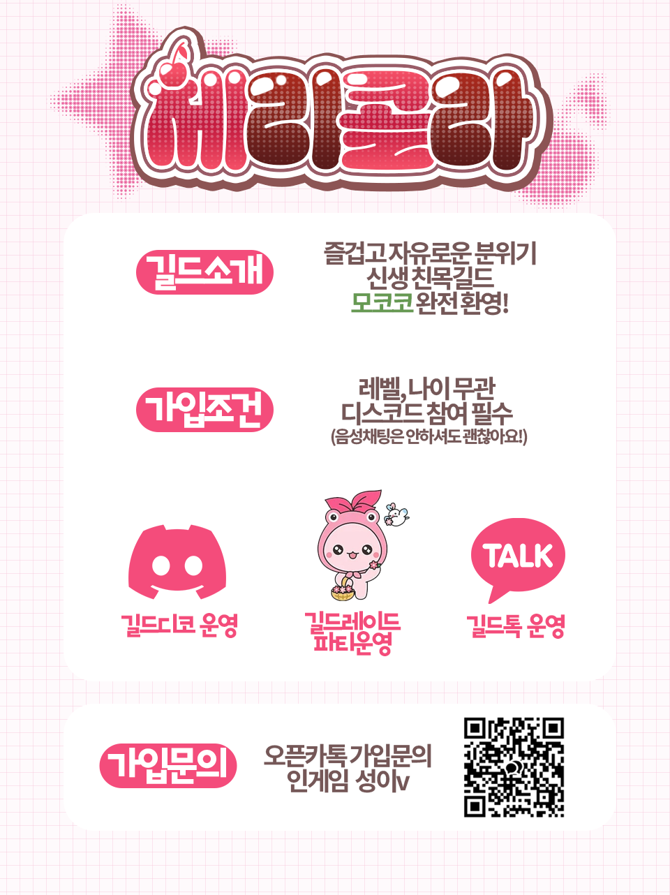 가입문의는 인게임 및 오픈카톡을 통해 연락주신다면 친절히 안내드릴게요!